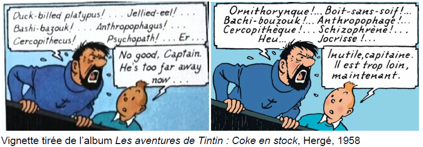 Afin de contourner ces contraintes, il est important de se rappeler qu’en français, n’importe quel terme peut être employé à titre d’insulte en fonction du contexte et de l’intention. L’un des exemples les plus célèbres de la littérature est probablement le capitaine Haddock et ses expressions toutes plus rocambolesques que les autres. Lui ne se contente pas d’insulter comme dans d’autres bandes dessinées à coups de « 💥@#☠️! » mais en employant soit des termes non familiers considérés comme dégradants, soit en employant des termes qui n’ont, à priori, rien d’insultant (qui s’offusquerait sincèrement d’être traité d’ornithorynque ?). Il s’agit d’insultes plus « familiales » où le registre familier est totalement absent et où on reconnaît leur nature d’insultes par le contexte. La traduction de ces termes en anglais est souvent littérale pour les termes neutres (« ascenseur »). Parmi les changements opérés par le traducteur anglais, on retrouve « boit-sans-soif » traduit en « jellied-eel » (signifiant gelée d’anguille, un plat londonien qui, soit dit en passant, ne semble pas très appétissant) ou encore l’omission complète de « Jocrisse », un personnage de comédie incarnant la sottise et la naïveté (référence peut-être moins commune pour les anglophones).